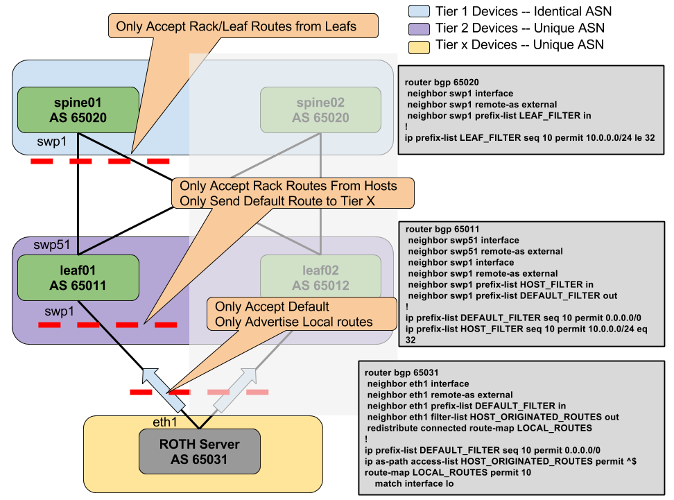 In the Clos topology, we recommend that you only use interface addresses to set up peering sessions. This means that when the link fails, the BGP session is torn down immediately, triggering route updates to propagate through the network quickly. This requires the following commands be enabled for all links: link-detect and ttl-security hops <hops>. ttl-security hops specifies how many hops away the neighbor is. For example, in a Clos topology, every peer is at most 1 hop away.