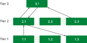 In the following illustration, tier 2 node 2.1 is acting as a route reflector server, announcing the routes between tier 1 nodes 1.1 and 1.2 to tier 1 node 1.3. It is also a route reflector client, learning the routes between tier 2 nodes 2.2 and 2.3 from the tier 3 node, 3.1.
