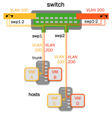 cumulus@switch:~$ net add bridge br-VLAN100 ports swp1.100,swp2.100