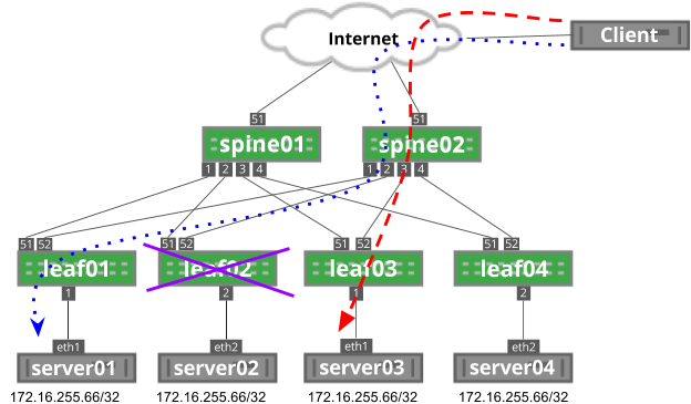 As you can see below, leaf03 is in a failed state. The blue dotted flow uses leaf02 to reach server02.