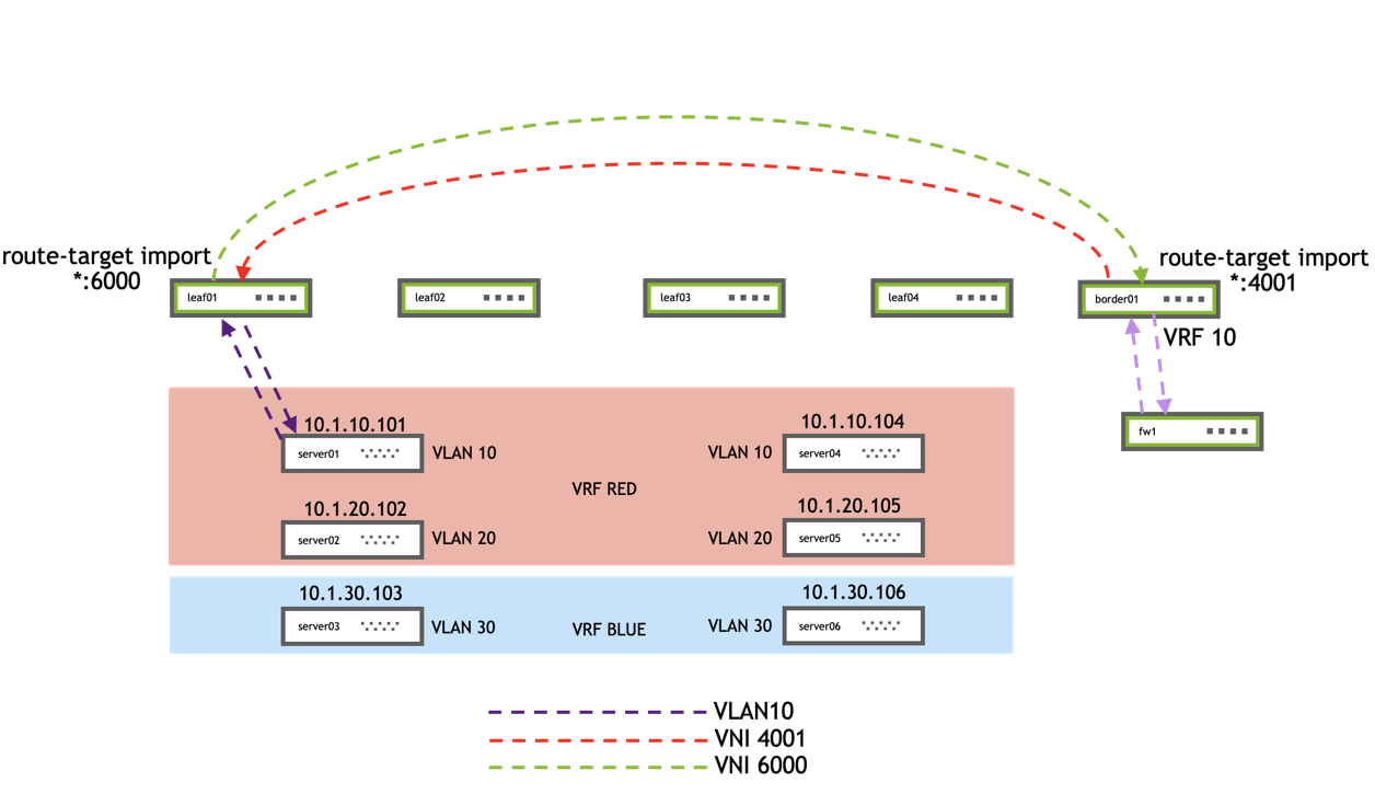 - fw1 has IP address 10.1.210.254 configured beyond border01 in VRF10.
