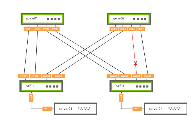 In the above example, when leaf03 interface swp3 goes down to spine02, BGP sends an update from spine02 to leaf01 with a less preferred weight for the leaf03 VTEP IP address, influencing underlay traffic between server01 and server04.