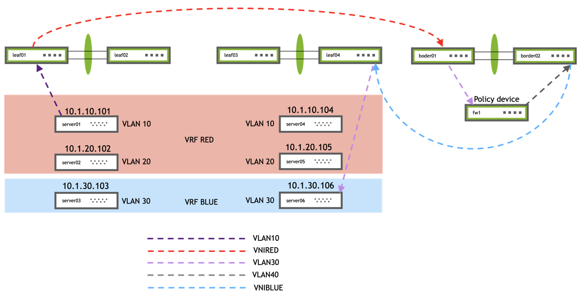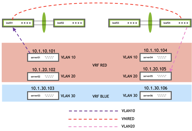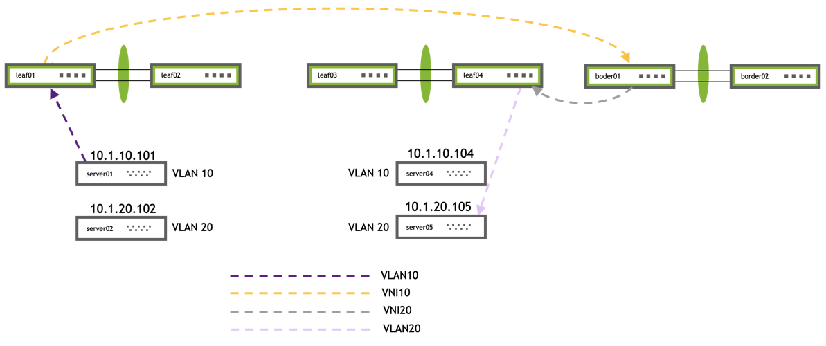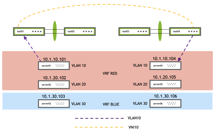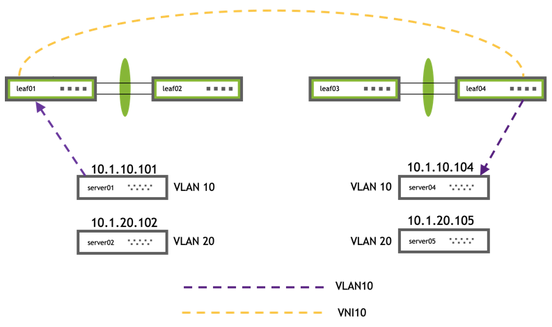 server01 and server04 are in the same VLAN but are across different leafs.