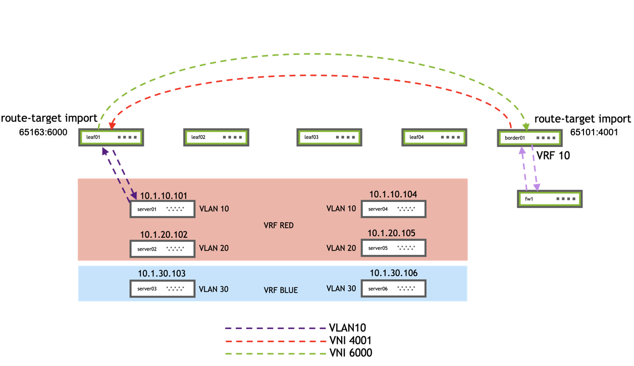 - fw1 has IP address 10.1.210.254 configured beyond border01 in VRF10.