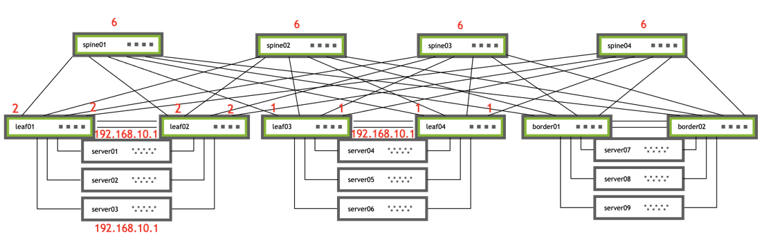 - leaf01 has two ECMP paths to 192.168.10.1/32 (through server01 and server03) whereas leaf03 and leaf04 have a single path to server04.