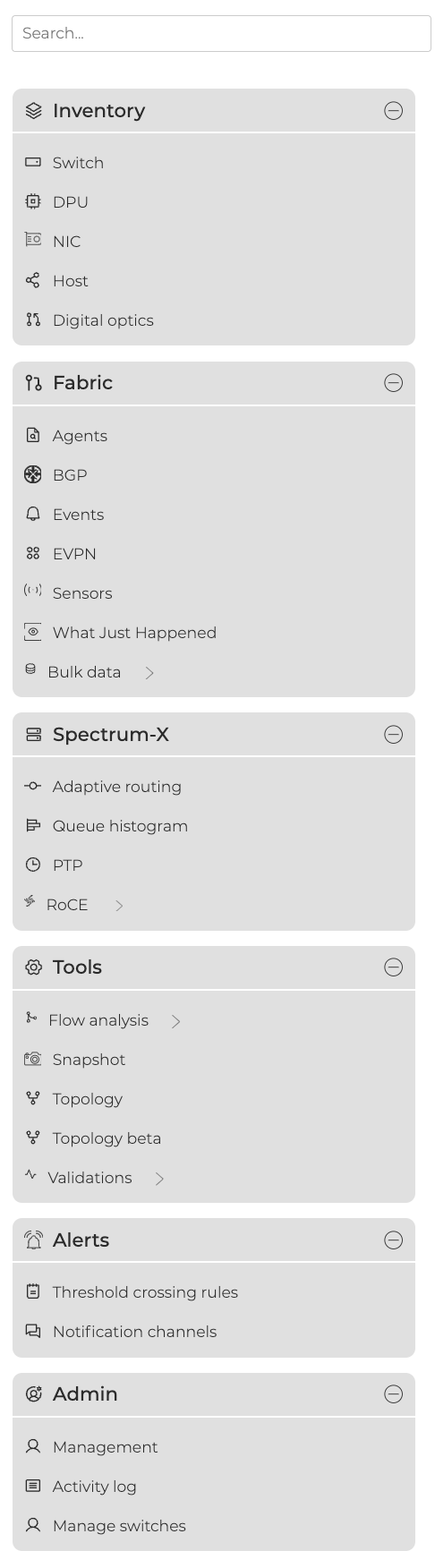 You can search for devices or cards in the global search field in the header. Right-click the hostname of any switch in your network to open a dashboard in a new tab that displays a comprehensive overview of platform information, events, and interfaces for that switch.