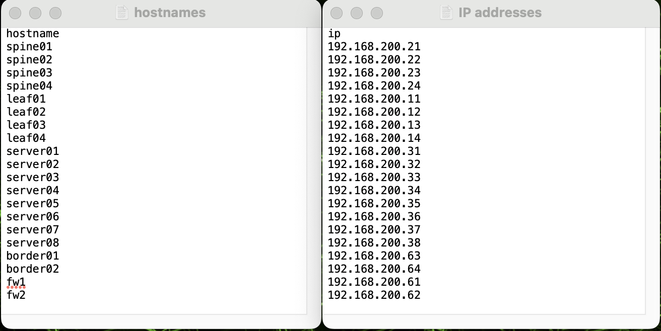 The CSV file must include a header containing either the word “hostname” or “ip”, followed by a list of either: