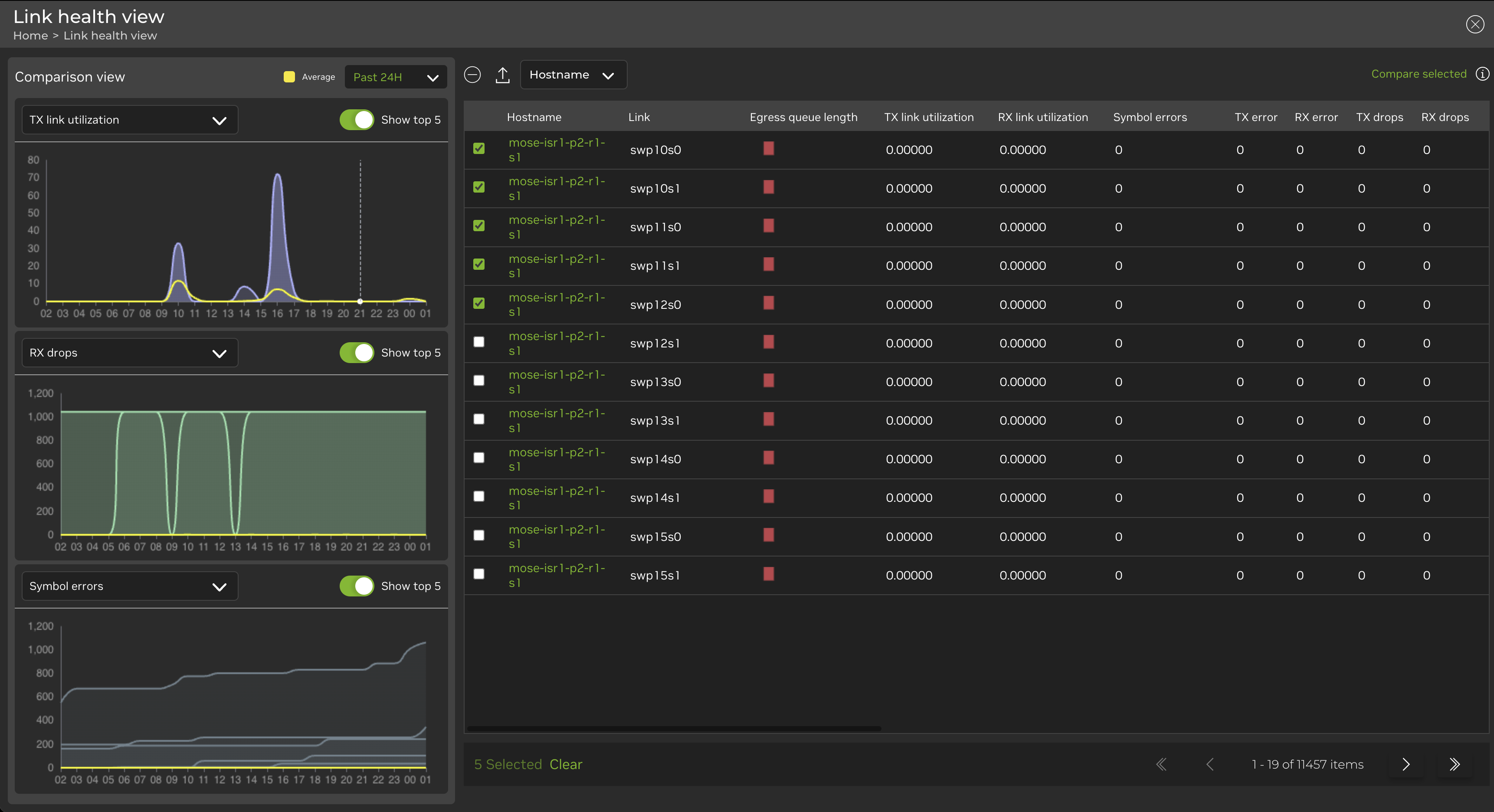 To compare links, select up to 20 links from the dashboard, then click Compare selected above the table. The comparison charts update to reflect the data from the links you selected. Toggle the Show top 5 switch on or off to view the top five and bottom five devices and their respective links according to the parameters you selected. In each of the charts, the x-axis represents time in hours, according to a 24-hour clock and the y-axis represents a count of the parameter you selected. The yellow line displays the average values for the selected links.