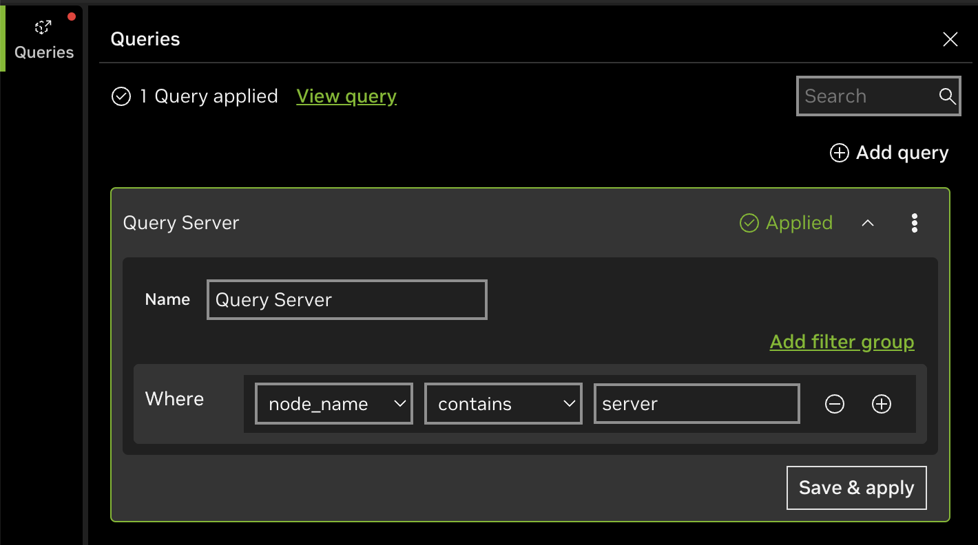 Select node_name and enter the parameters to display a subsection of nodes based on their hostnames. To combine multiple queries with logical operators, select Add filter group.