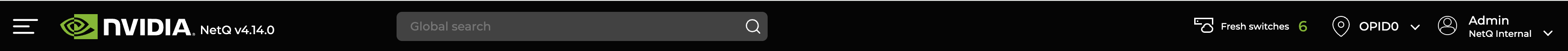 • Application Header: Contains the main menu, NetQ version, global search field, count of reachable devices, premises list, and account information.