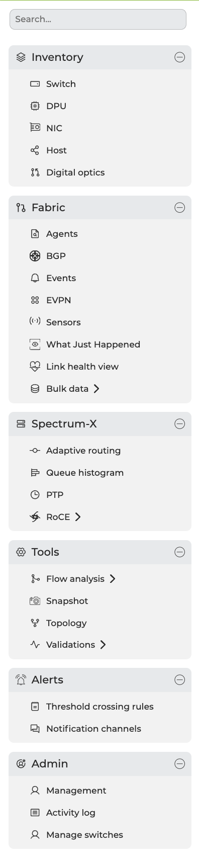 • Fabric: lists various network elements which you can select to monitor your network’s state