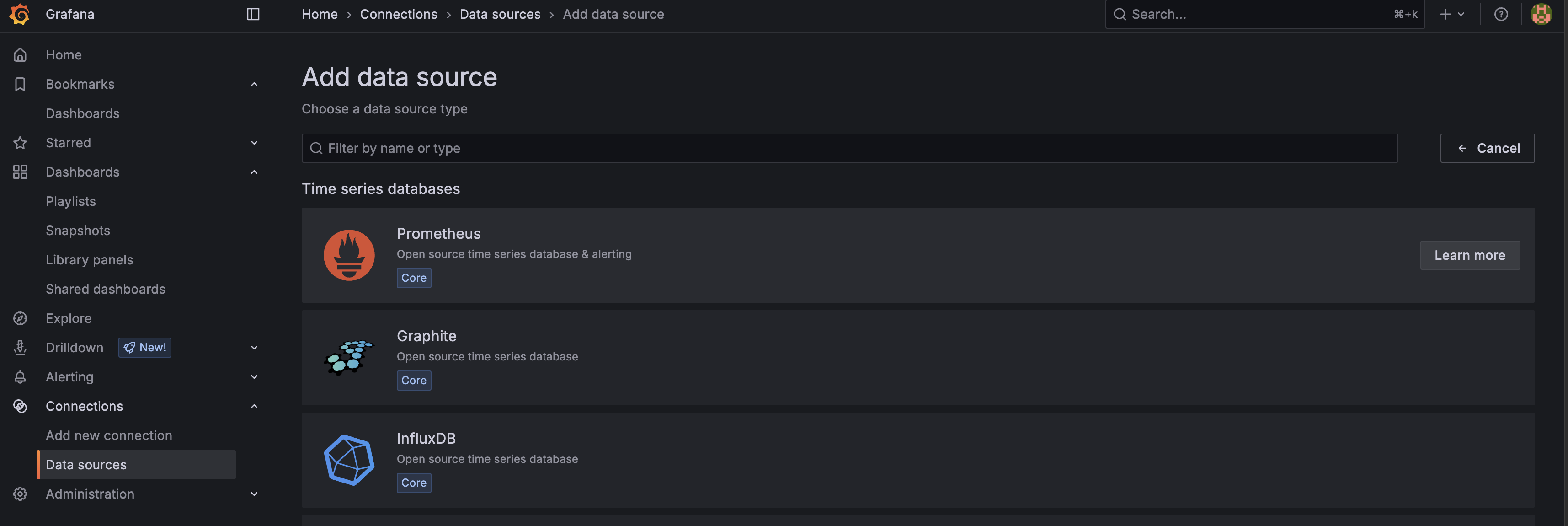 - Navigate to your Grafana dashboard. From the menu, select Connections and then Data sources. Select Add new data source and add the Prometheus TSDB: