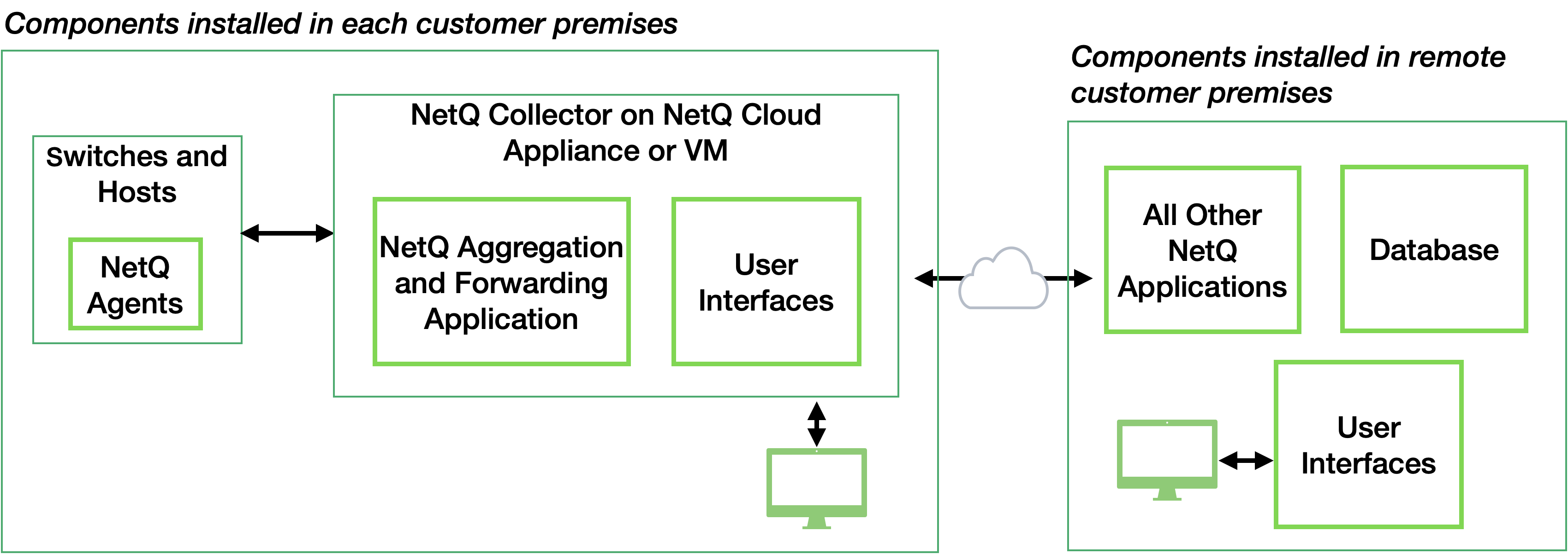 - Hosted remotely: Choose this deployment to host a multi-site, on-premises deployment or use NetQ Cloud. In the multi-site deployment, you host multiple small servers at each site and an on-premises appliance at a central location. In the cloud deployment, you host only a small, local server on your premises that connects to the NetQ Cloud service over selected ports or through a proxy server. NetQ Cloud supports local data aggregation and forwarding—the majority of the NetQ applications use a hosted deployment strategy, storing data in the cloud. NVIDIA handles the backups and maintenance of the application and storage. This remote cloud service model is a good choice when you have limited in-house support or if you need the flexibility to scale quickly, while also reducing capital expenses.