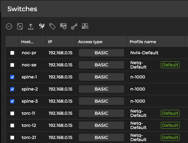 netq lcm show switchesto display a list of switches. Note the hostname of the switch(es) you’d like to attach a profile to. -