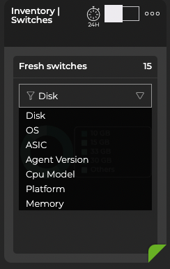 Open the large Inventory/Switches card to display more granular information about software and hardware distribution. By default, the card displays data for fresh switches. Select Rotten switches from the dropdown to display information for switches that are in a down state. Hover over the top of the card and select a category to restrict the view to ASICs, platform, or software.