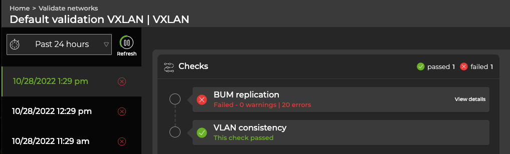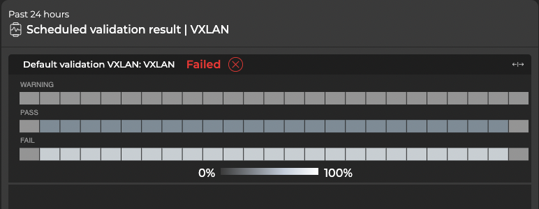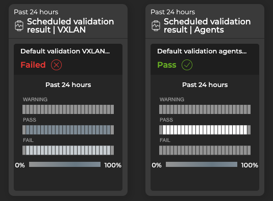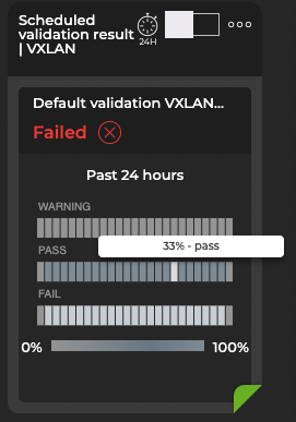 After creating scheduled validations with either the NetQ UI or the NetQ CLI, the results appear in the Scheduled Validation Result card. When a request has completed processing, you can access the Validation Result card from the full-screen Validations card. Each protocol and service has its own validation result card, but the content is similar on each.