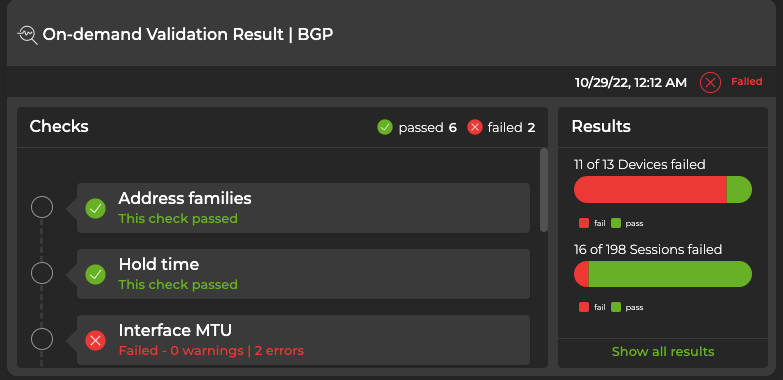 The respective On-demand Validation Result card opens on your workbench. If you selected more than one protocol or service, a card opens for each selection. To view additional information about the errors reported, hover over a check and click View details. To view all data for all on-demand validation results for a given protocol, click Show all results.