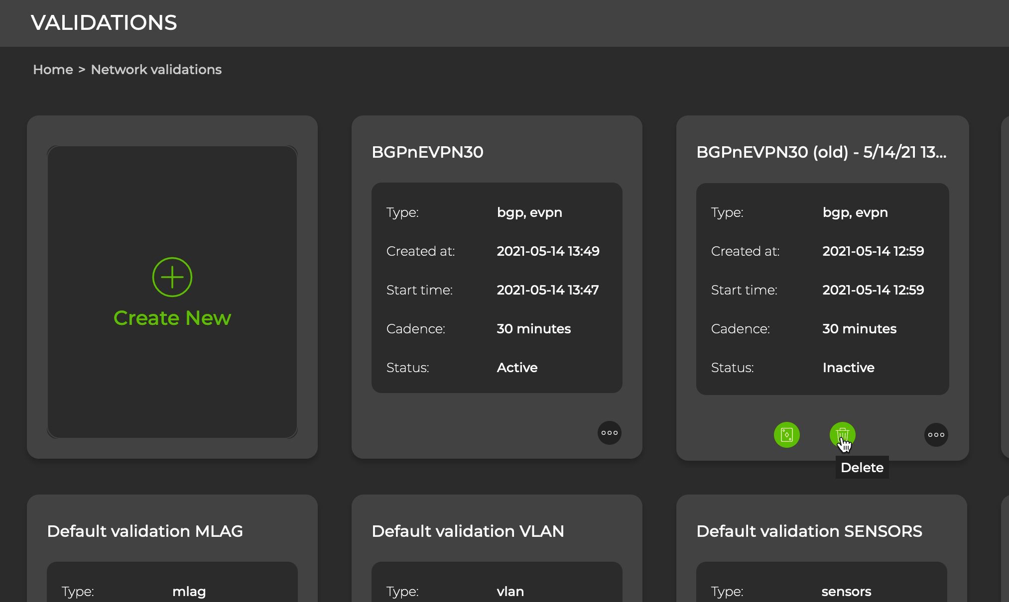 You can remove a user-defined scheduled validation using the NetQ UI or the NetQ CLI. Default validations cannot be deleted, but they can be disabled.