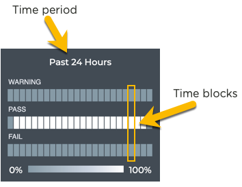 On the medium and large Validation Result cards, vertically stacked heat maps represent the status of the runs; one for passing runs, one for runs with warnings, and one for runs with failures. Depending on the time period of data on the card, the number of smaller time blocks indicate that the status varies. A vertical stack of time blocks, one from each map, includes the results from all checks during that time. The results appear by how saturated the color is for each block. If all validations during that time period pass, then the middle block is 100% saturated (white) and the warning and failure blocks are zero % saturated (gray). As warnings and errors increase in saturation, the passing block is proportionally reduced in saturation. The example heat map for a time period of 24 hours shown here uses the most common time periods from the table showing the resulting time blocks and regions.