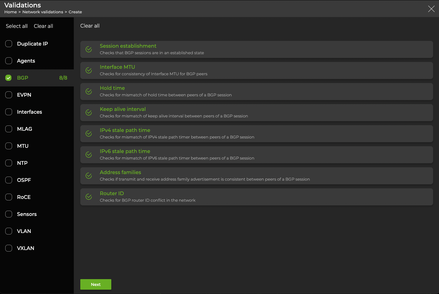 This example has BGP selected and displays the 8 checks that NetQ runs during a BGP validation: