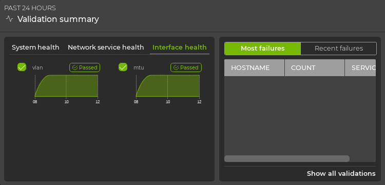 The health of interfaces, VLANs, and link MTUs is represented on the left side of the card. Hover over the chart for each type of validation to see detailed results. The right side of the card displays devices with failures related to interfaces, VLANs, and link MTUs.