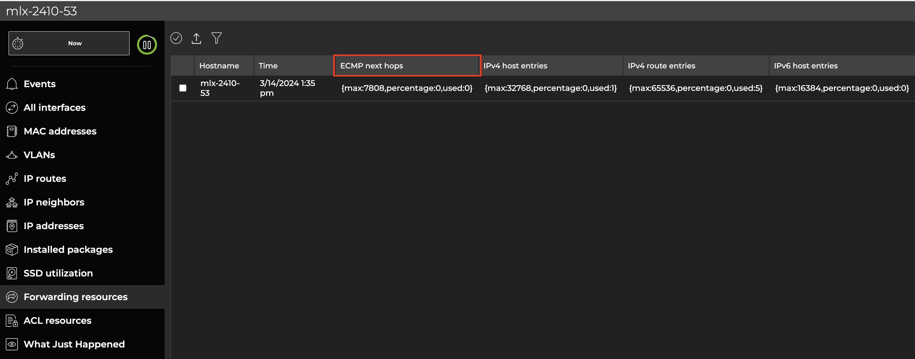 Select Forwarding resources from the side menu. The ECMP next hops column displays the maximum number of hops seen in the forwarding table, the number used, and the percentage of this usage compared to the maximum number.
