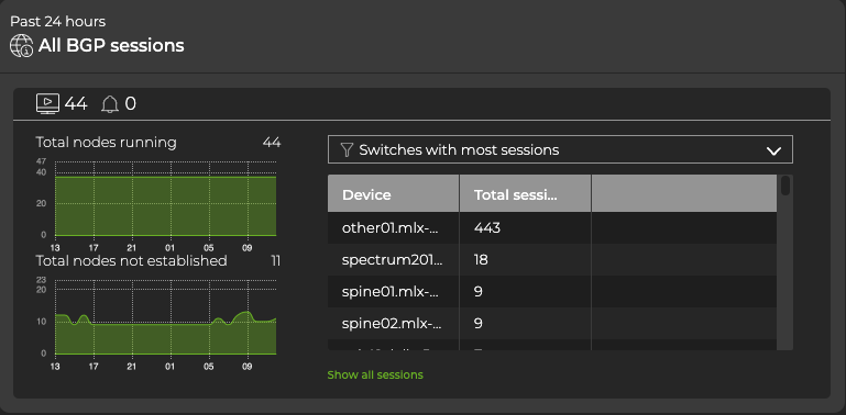 Expand to the large card for additional BGP info. By default, the card displays the Sessions summary tab. From here you can see which devices are handling the most BGP sessions, or select the dropdown to view nodes with the most unestablished BGP sessions. You can view BGP-related events by selecting the Events tab.