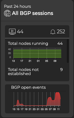 To add the BGP card to your workbench, navigate to the header and select Add card > Network services > All BGP Sessions card > Open cards. In this example, there are 44 nodes running the BGP protocol, 252 open events (from the last 24 hours), and 9 nodes with unestablished sessions.