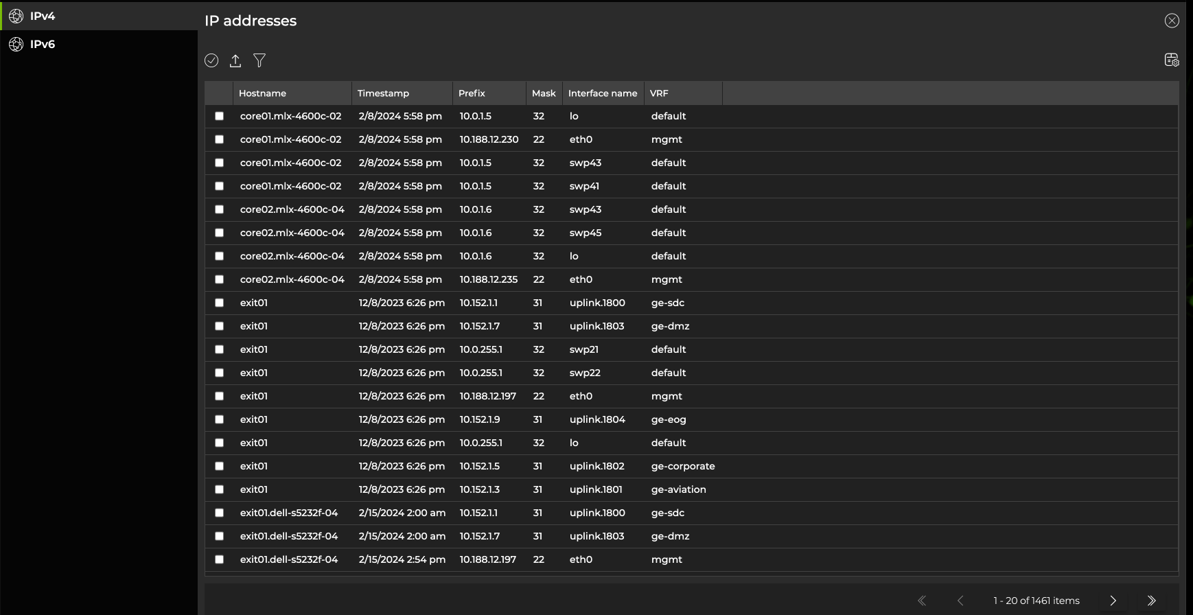 IPv4 and IPv6 address, neighbor, and route information is available in the NetQ UI. To access this information, select the Menu. Then select IP addresses, IP neighbors, or IP routes from the list of options. The following image displays a list of IP addresses: