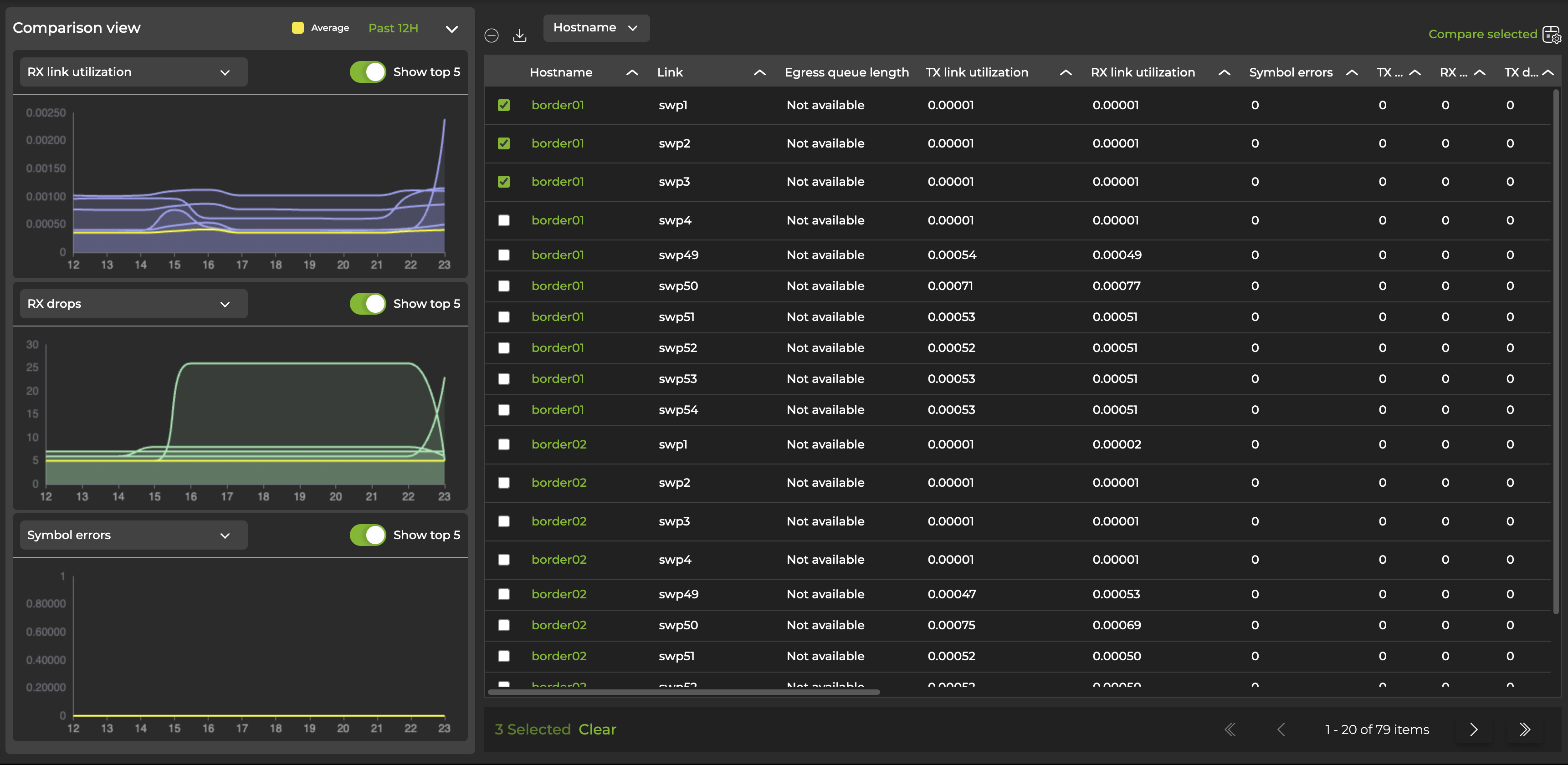 To compare links, select up to 20 links from the dashboard, then click Compare selected above the table. The comparison charts update to reflect the data from the links you selected. Toggle the Show top 5 switch on or off to view the top five and bottom five devices and their respective links according to the parameters you selected. In each of the charts, the x-axis represents time in hours, according to a 24-hour clock and the y-axis represents a count of the parameter you selected. The yellow line displays the average values for the selected links.
