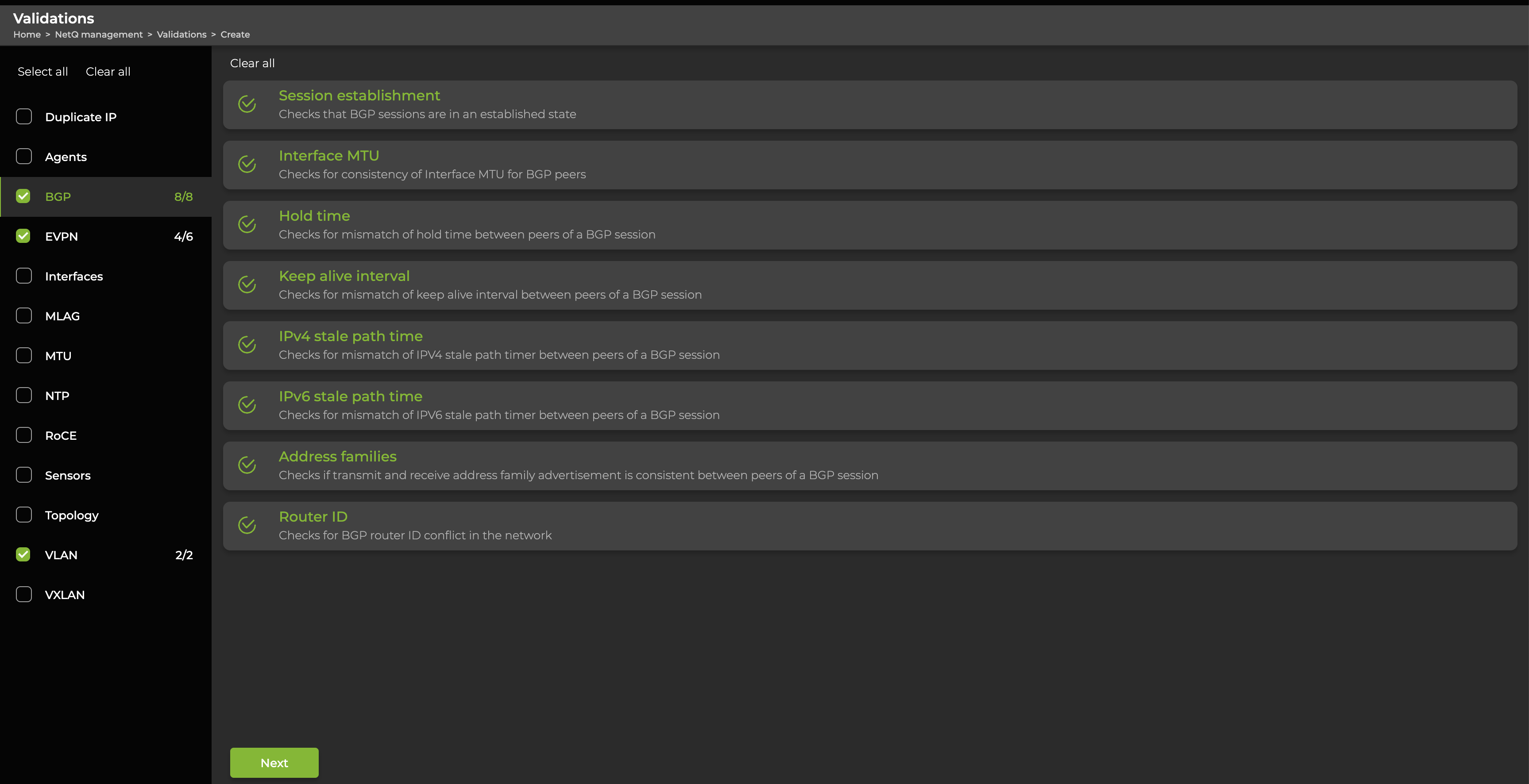 This example shows all scheduled validations for BGP: