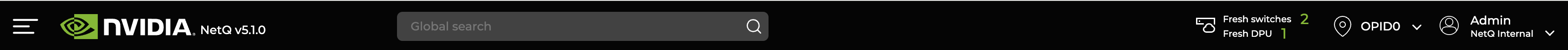 Application Header: Contains the main menu, NetQ version, global search field, count of reachable devices, premises list, and account information.