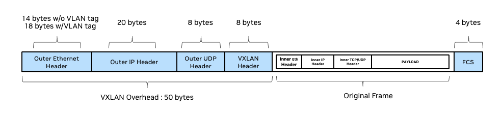 The following illustration compares VXLAN encapsulation overhead to an Ethernet frame: