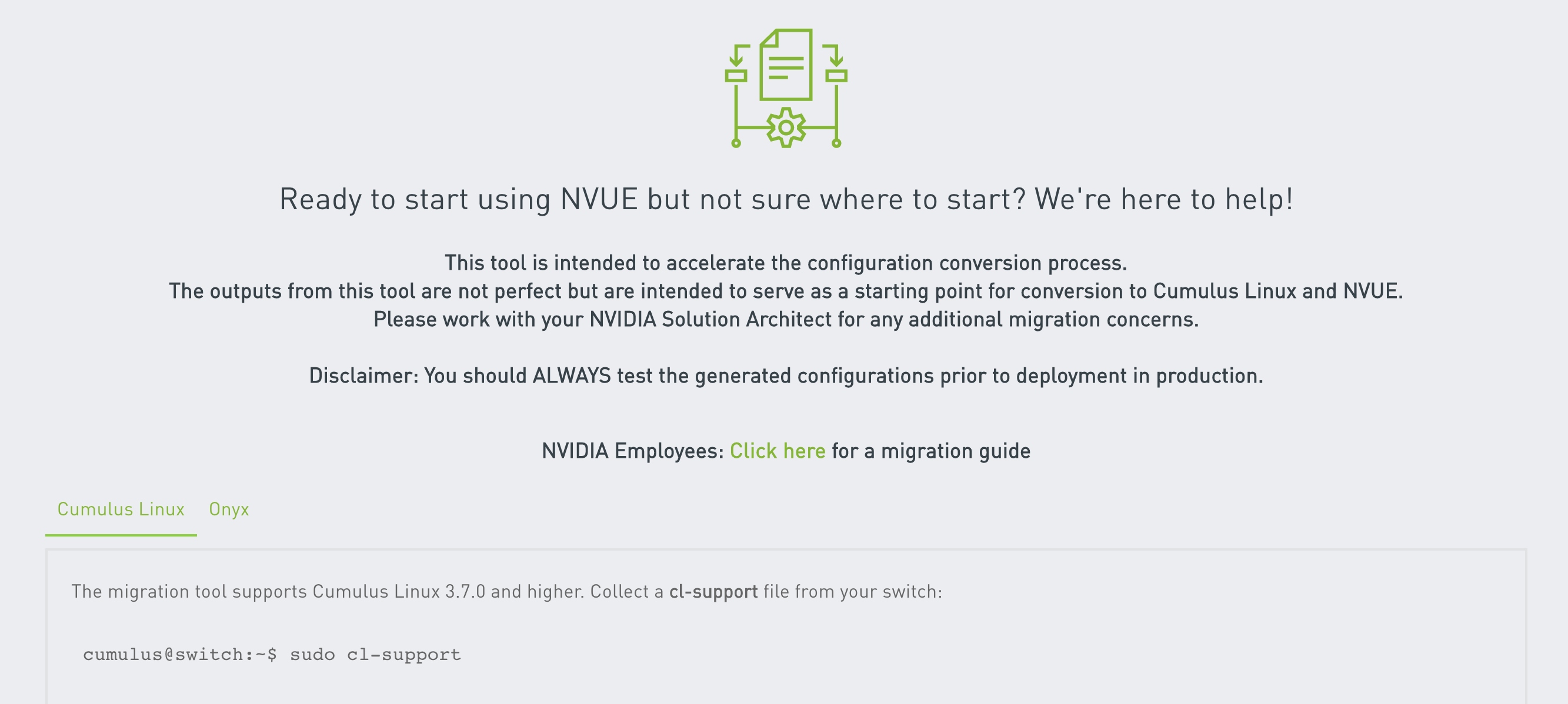 The NVUE Migration tool is designed to help you automate migration from older Cumulus Linux systems that support NCLU and ONYX to the newer systems that support NVUE.