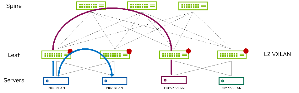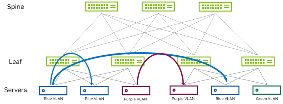 - The leaf switches only need to host the VLANs and the corresponding VNIs that are located on its rack, as well as the L3VNI and its associated VLAN. The ingress leaf switch doesn’t need to know the destination VNI.