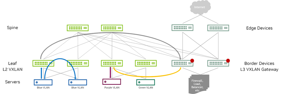 - The need for inter-VXLAN routing to happen within the fabric. This approach has the advantage of centralizing and consolidating the routing function (instead of distributing it at the leaf layer).