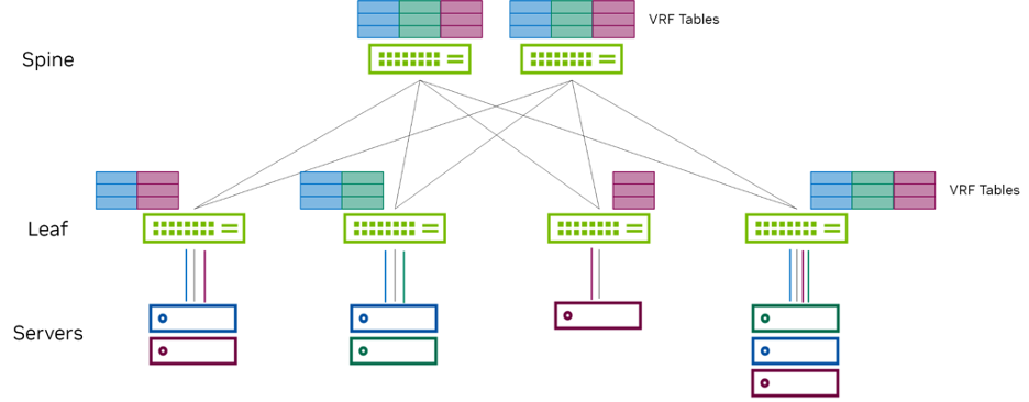 - Each ToR (leaf) is a VTEP and hosts the VLANs (mapped to VNIs) located on its rack.