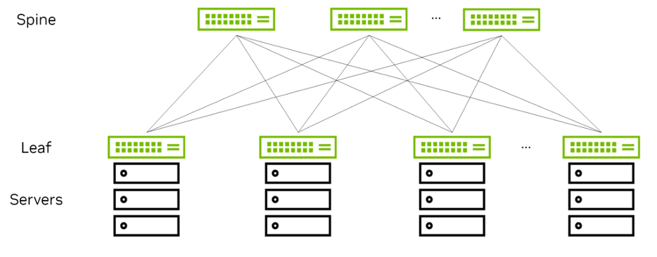Figure 1 shows the most common Clos two-tier topology. The green nodes represent the switches and the black nodes the servers. There are two layers of switches: spine and leaf, therefore, the topology is commonly called a leaf-spine topology.