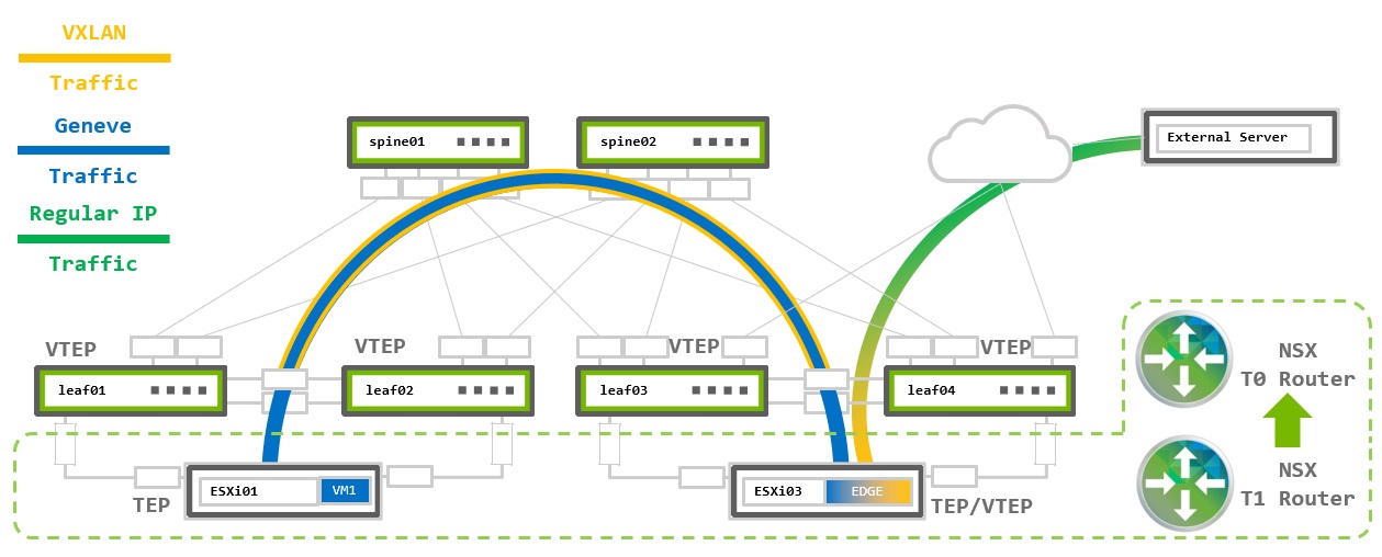 In the above diagram, Edge VM is located on the ESXi03 hypervisor. It establishes BGP-EVPN peerings with his local leaf03 and leaf04 switches. Those leaf switches, which are called “Border Leafs” (EVPN fabric gateway to external networks), are part of the underlay EVPN fabric and have an EVPN type-5 route to the external server. This route is then populated also to the Edge VM.